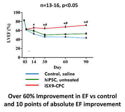 With ISX9-CPC, in an in vivo proof-of-concept peer reviewed study of a single treatment of our patented ISX9-CPC's reduced dead scar tissue by 70% and restored heart function by over 60% EF improvement vs. control 90 days after heart attack. With GIVI-MPC, we created significant new human skeletal muscle along with 100% full length human dystrophin in mdx mice and in dystrophic pigs.
