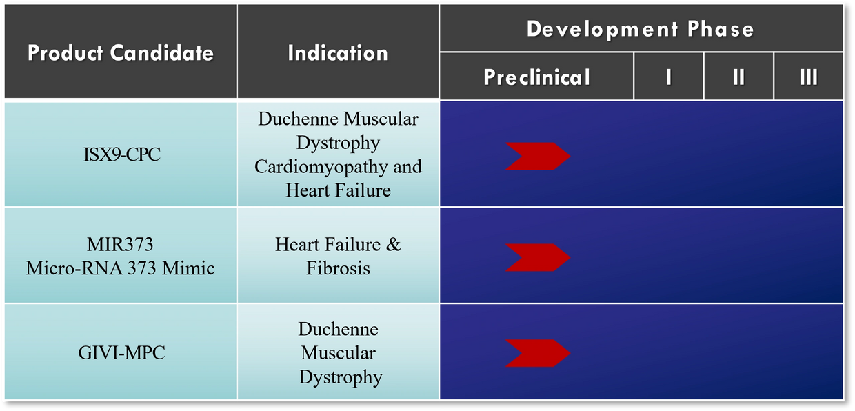 We are advancing a pipeline of two single-course stem cell therapeutics intended to safely and durably create new heart muscle and new skeletal muscle in DMD patients. We aim to later expand clinically beyond duchenne cardiomyopathy to the larger core MI/heart failure market with ISX9-CPC and will also expand beyond DMD patients for GIVI-MPC to other rare muscle diseases.